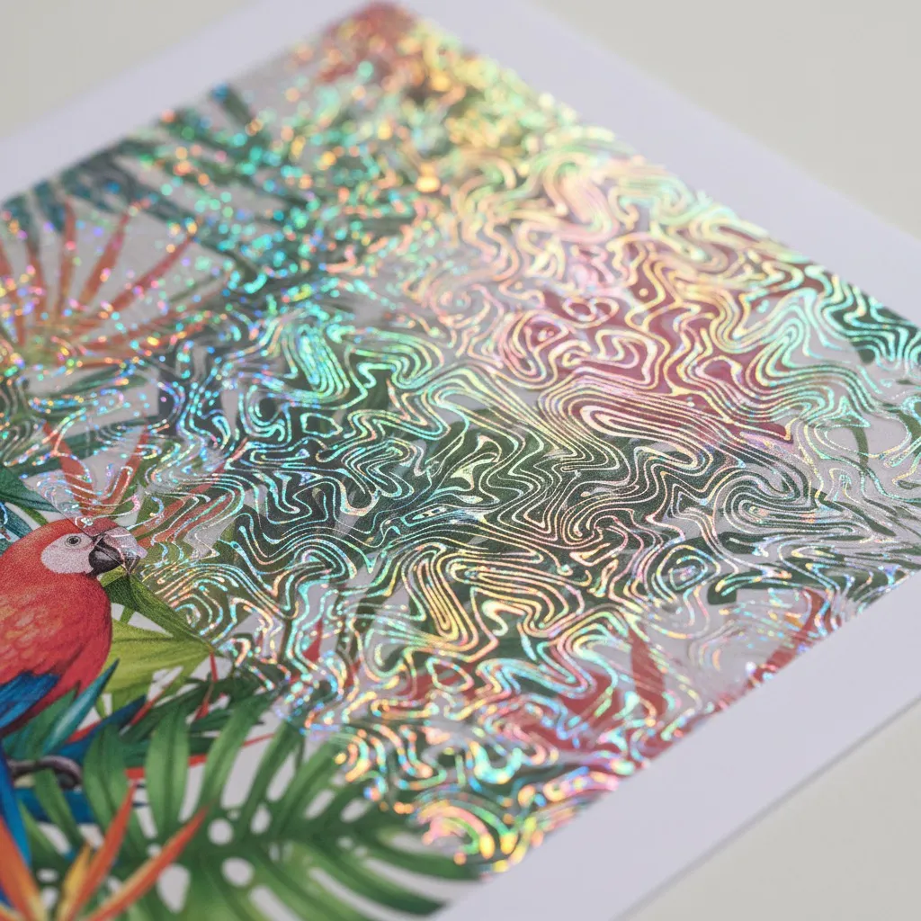 Cast & Cure folie is een speciale folie die drukwerk een spectaculair en luxueus effect geeft. De techniek werkt door het aanbrengen van een speciale laklaag die tijdens het drogen in contact komt met de folie. Hierdoor ontstaat een opvallend optisch patroon dat varieert met de lichtinval en de kijkhoek.
